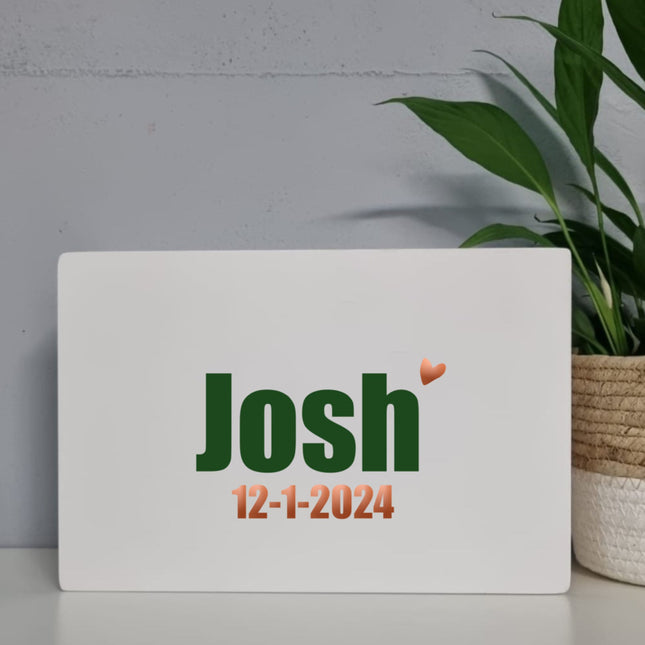 We hebben 2 soorten kisten, beide herinneringskisten, zijn gemaakt van massief vurenhout. We hebben een naturel herinnering kist en een wit gelakte herinnering box. De deksel bedrukken we met een print naar keuze. We bedrukken onze kisten met hoogwaardige stickervinyl. Een herinneringsdoos is niet alleen leuk voor jezelf, maar ook erg leuk om cadeau te geven.