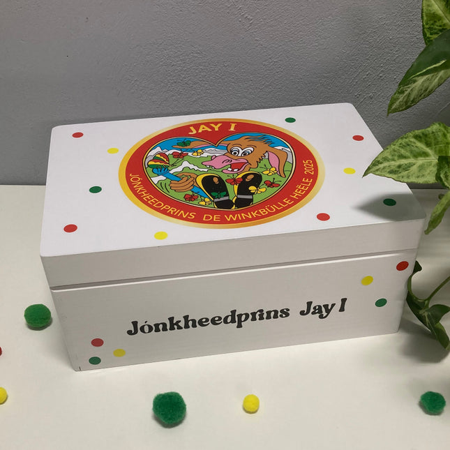 De gepersonaliseerde herinneringskist met naam wordt speciaal voor jou gemaakt. We bedrukken deze houten kist met een design uit ons assortiment of met een afbeelding en tekst naar wens. Er zijn veel verschillende designs om uit te kiezen; zo is er voor ieder wat wils! Wil je geen bestaand design, maar een op maat gemaakte herinneringskist? Dat kan natuurlijk ook! Bel of mail ons voor de mogelijkheden.