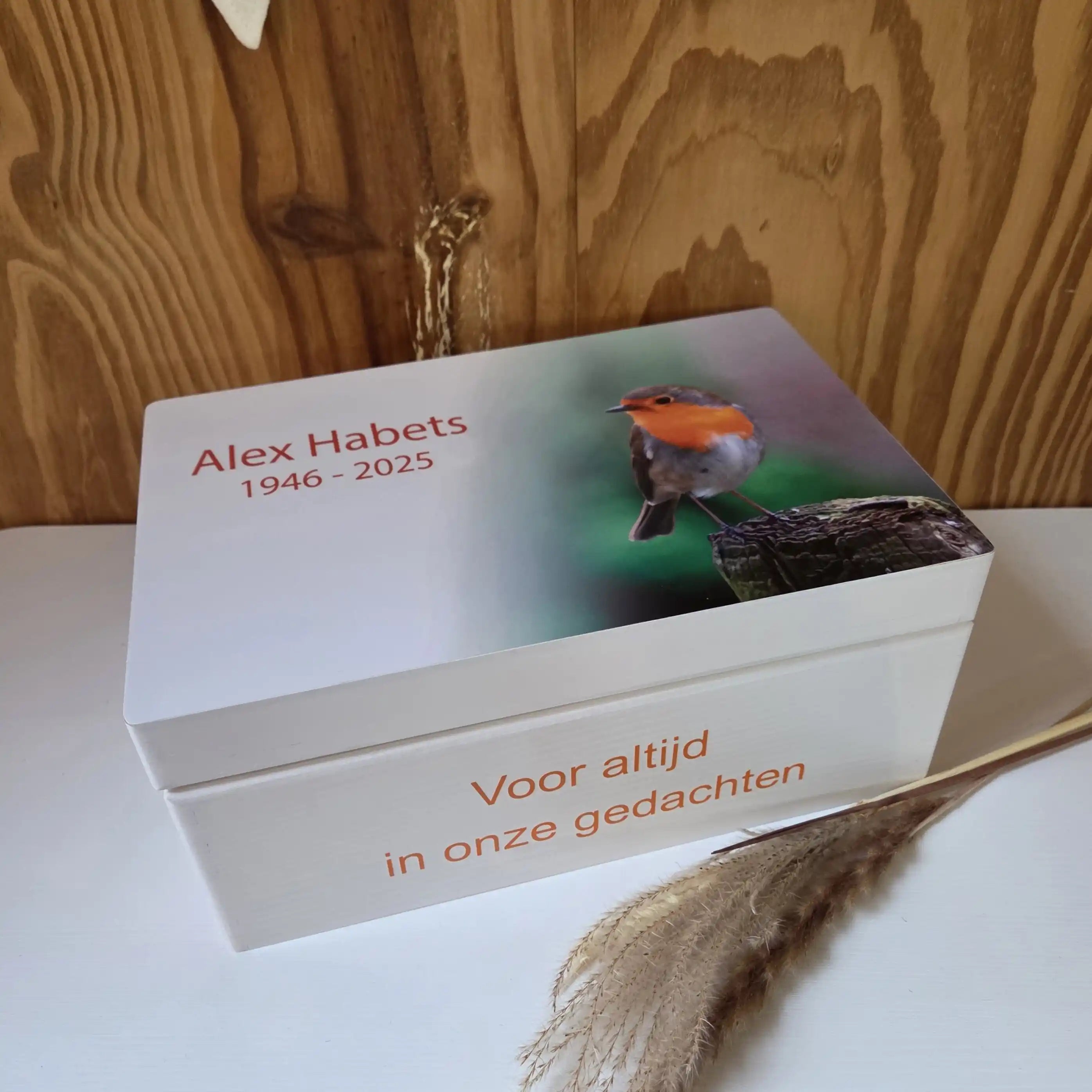 Door de kist te personaliseren in de stijl van het rouwprentje en met eventueel een dierbare boodschap, creëer je een blijvend herinnering aan zijn/haar leven en liefde. Een herinneringskist is een mooie plek om de kostbare momenten die jullie samen hadden, te koesteren en levend te houden. Of het nu gaat om een verjaardag of een andere betekenisvolle dag, met een herinneringskist zorg je ervoor dat zijn of haar aanwezigheid altijd dichtbij is.