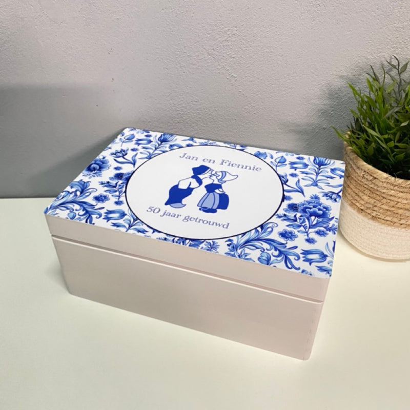 Een herinneringskist met daarop een afbeelding in de stijl van een uitnodiging voor een jubileum of een foto, waarin u de mooiste herinneringen aan een mooie, speciale tijd kunt stoppen. Op deze manier blijven alle waardevolle momenten van een jubileum samen op één plek bewaard.