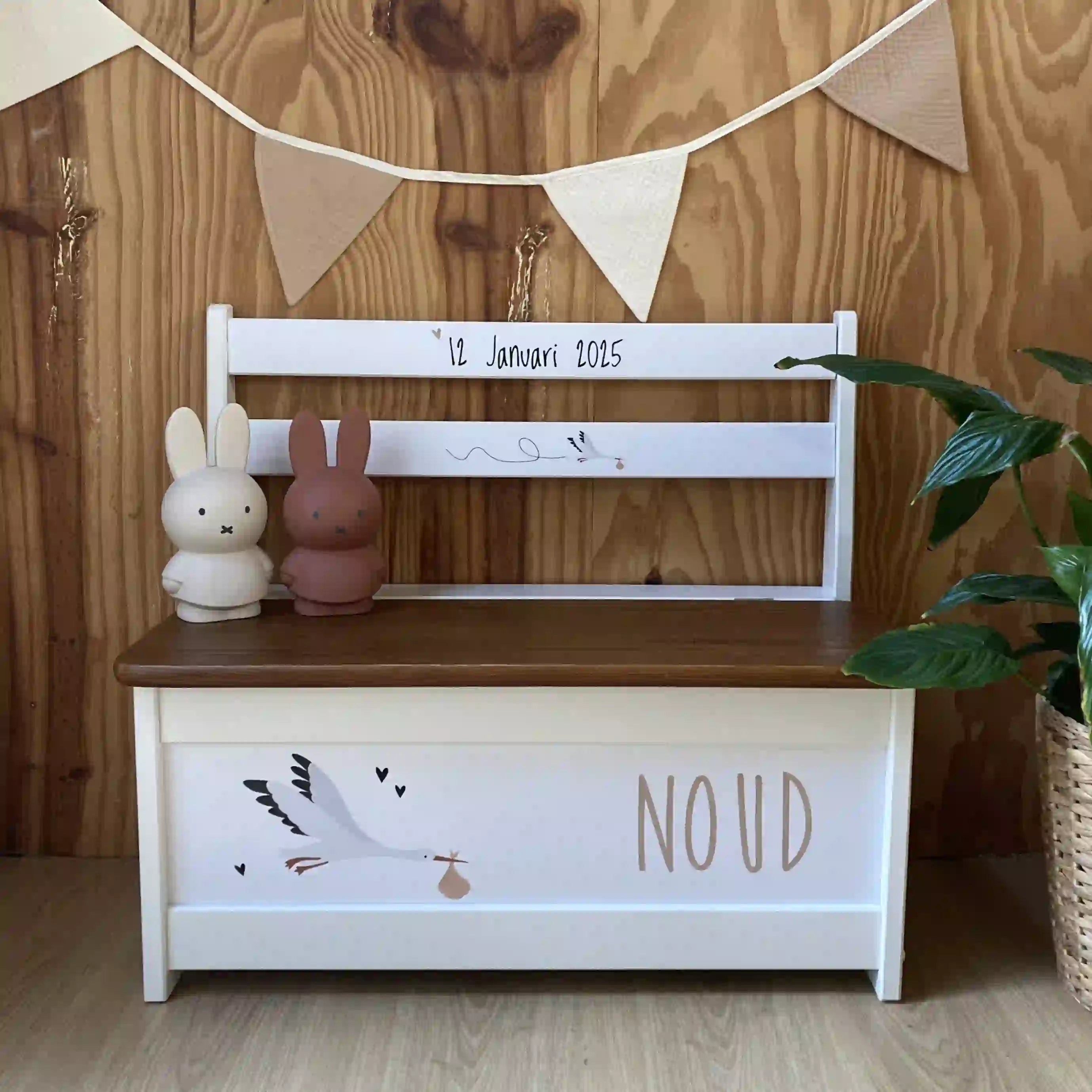 Mooi en stevig opbergbankje "in stijl van het geboortekaartje".Optioneel met kussentje in kleur naar wens. Dit bankje is optimaal afgestemd op de...