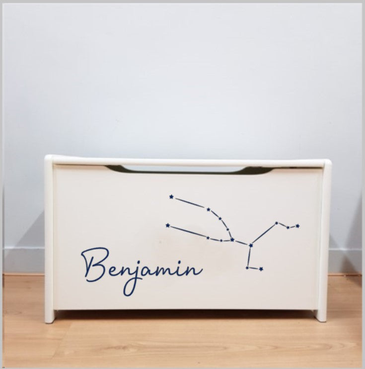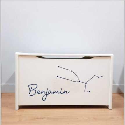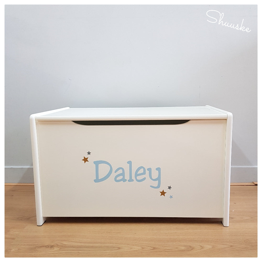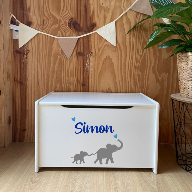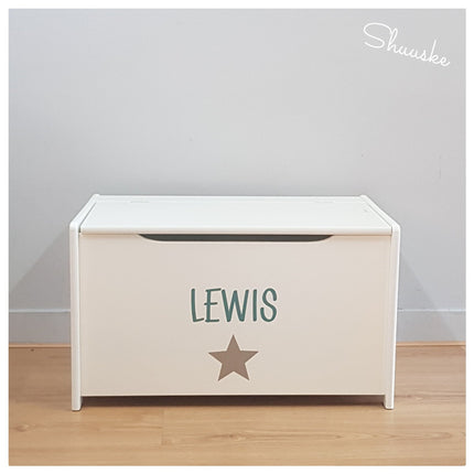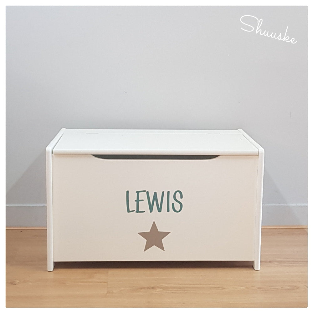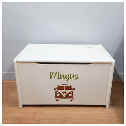 Mooie witte houten speelgoedkist met naam en afbeelding naar wens, er is heel veel mogelijk. Van een Volkswagen busje tot een tractor of trein. Van een muisje tot een kip of schaapje... wat zou u leuk vinden? We maken graag een speelgoedkist naar wens voor u!